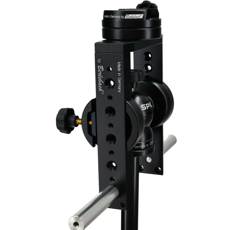 Da die Klemmeinheit für die Instrumente nicht wie üblich zwischen der Gabel sondern oben montiert wird, ist genügend Platz vorhanden, um auch sehr große Optiken wie Binoculare zu befestigen.