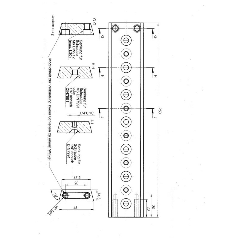 Trous taraudés 1/4" pour vis à tête fraisée à une distance de 35 mm et trous traversant pour vis à tête fraisée M6 ou 1/4" à une distance de 35 mm- Tous les rails peuvent aussi également être vissés à un coude